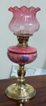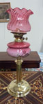 Victorian brass oil lamp with pink handpainted oil bowl and ruby glass shade