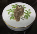 Coalport porcelain trinket box with gold rim and tawny owl and foliate image miniature painting on lid, 10.5cm diameter
