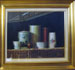 Oil on canvas board by George Harlowe "Still life with porcelain and fruit", 16" x 24" approx.